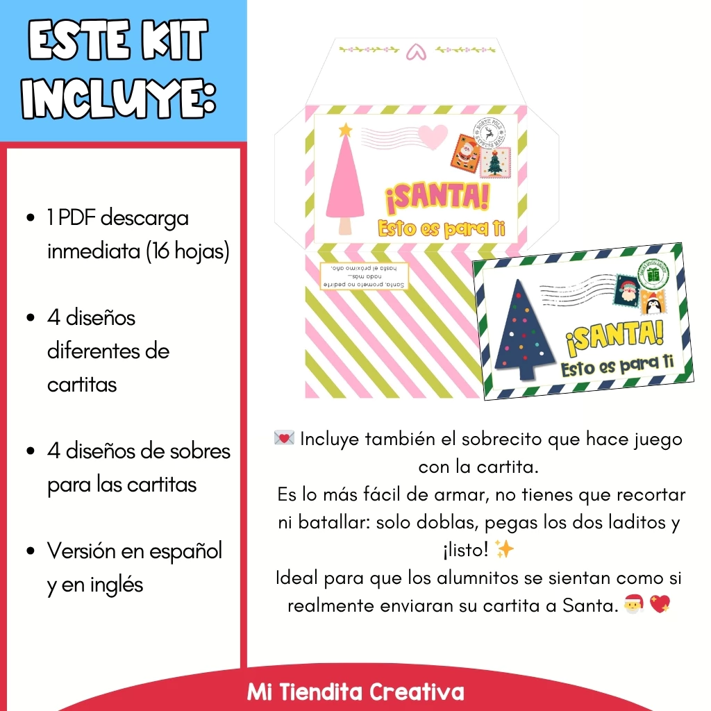¡Hagamos la Navidad más especial! Estas cartitas están listas para que tus alumnos le escriban a Santa de forma divertida y fácil. Vienen con diseños súper lindos que les encantarán, y además son perfectas para practicar la escritura mientras sueñan en grande. Úsalas en clase o mándalas a casa como actividad navideña. ¡Un detalle sencillo que hará brillar su ilusión por la Navidad!