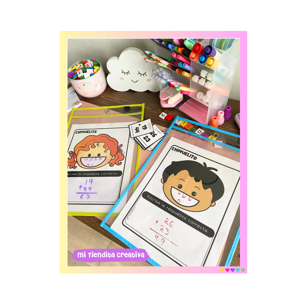 Imagina a tus estudiantes emocionados eligiendo su hoja de trabajo con su Chimuelito favorito, ¡cada uno más adorable que el anterior! Con "Chimuelitos", tus alumnos trabajarán en equipo para resolver sumas mientras dan vida a su Chimuelito, ¡pintando un diente por cada suma resuelta correctamente!