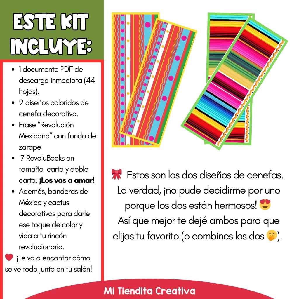Este kit está pensado para que tu salón se llene de color, historia y aprendizaje. Además de ser una decoración hermosa, es informativa, ya que incluye los divertidos RevoluBook: los perfiles de “Facebook” de los personajes más importantes de la Revolución Mexicana.