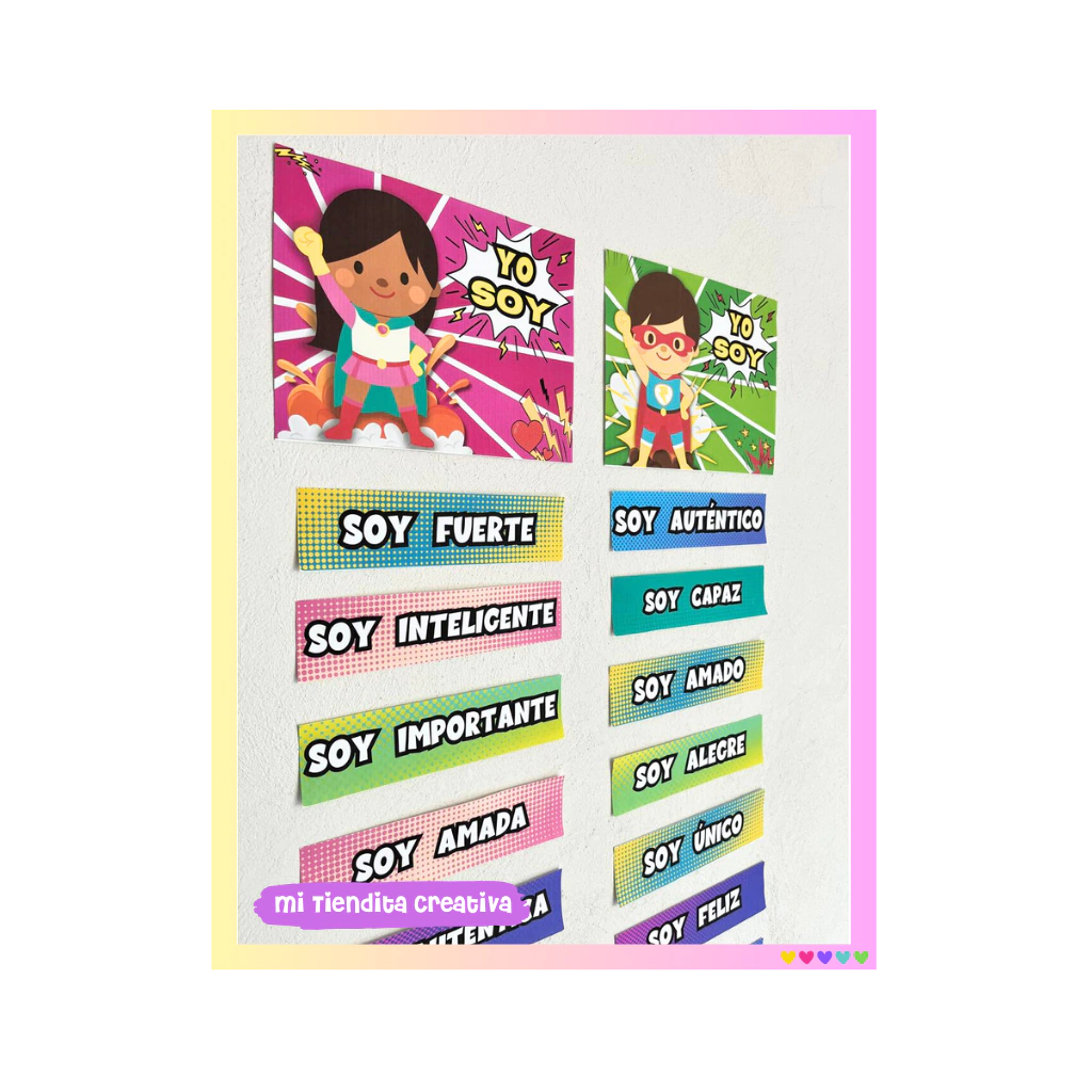 Este producto no solo embellece tu salón de clases con posters de superhéroes, sino que también fortalece la parte socioemocional de tus alumnos. Está diseñado para trabajar y reforzar la confianza y motivación en cada estudiante, recordándoles lo especiales y únicos que son.