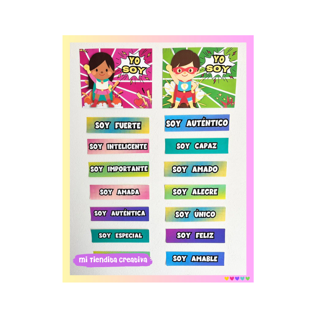 Cada poster presenta un superhéroe junto con una afirmación positiva, como "Soy valiente", "Soy fuerte", "Soy inteligente" y muchas más. Estas afirmaciones no solo fomentan la autoestima, sino que también promueven un ambiente de respeto propio y confianza en las habilidades individuales de cada alumno.